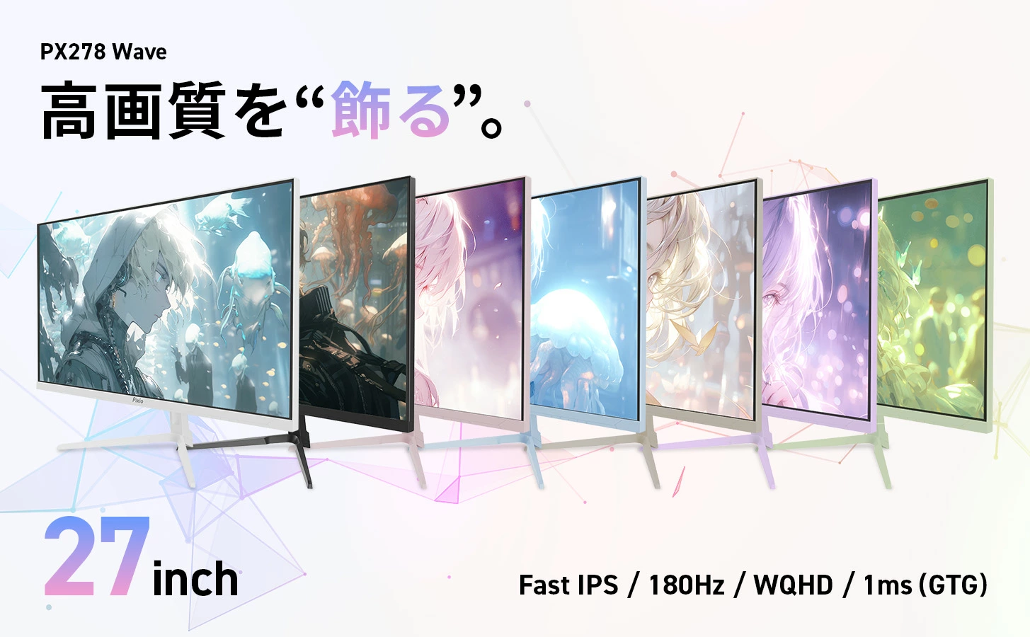 PX278 WAVEはFast IPSパネルを搭載し、TNパネル並みの応答速度1msを実現しつつ、IPSパネルならではの広い視野角と美しい色彩を両立。ゲームの激しい動きも残像感なくクリアに描出し、FPSやレースゲーム、eスポーツシーンでの勝率アップをサポートします。