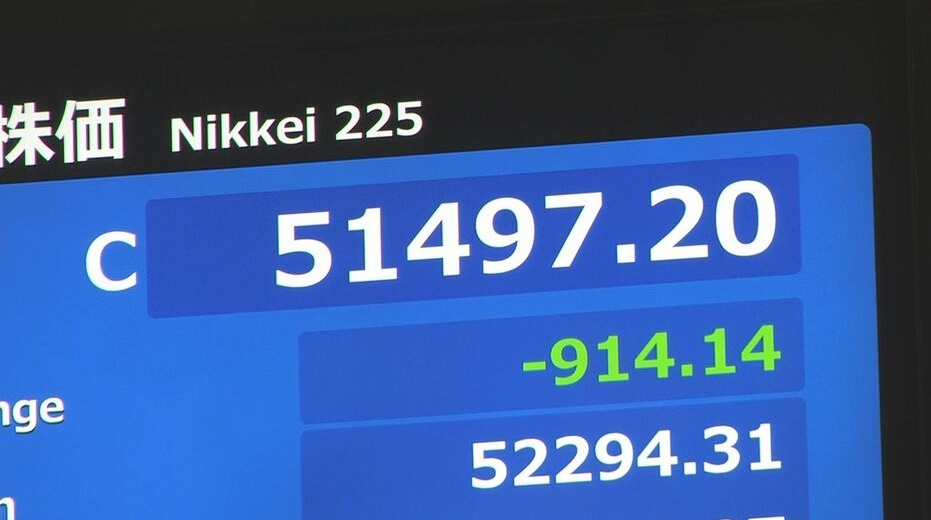 東京株式市場で、日経平均株価は先週末の終値から914円安い5万1497円と、節目の5万2000円を割り込んで、きょうの取引を終えました。